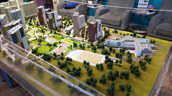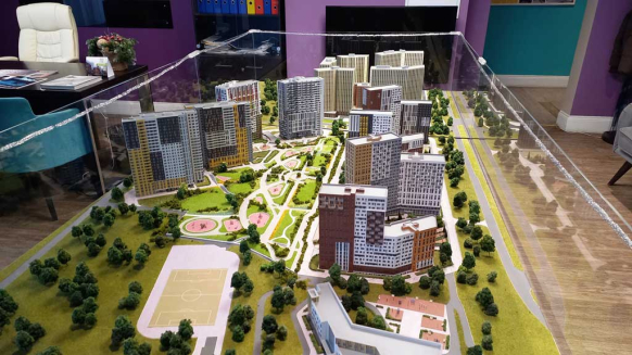 Помещение небольшое, но в нем нашлось место для менеджера по регистрации посетителей, специалиста по продажам и макета новостройки.