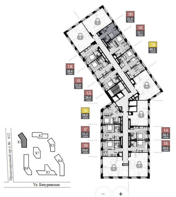 Здания 1 – 2 секционные, в каждой секции от 13 до 17 квартир на этаже и 3 или 4 лифта. Лоджии или балконы не предусмотрены. Все здания имеют общий стилобат, в котором расположена двухуровневая автопарковка на 612 машиномест и индивидуальные кладовые помещения. Площадь машиномест 13,3 кв.м., площадь кладовых от 2,3 до 15,5 кв.м. На поверхности земли оборудуют 42 места для хранения автомобилей маломобильных граждан.