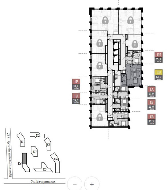 В продаже одно- и двухкомнатных квартир в корпусах №№ 1 и 6 площадью от 28,1 до 53,4 кв.м., всего около 40 вариантов планировок.