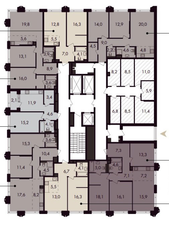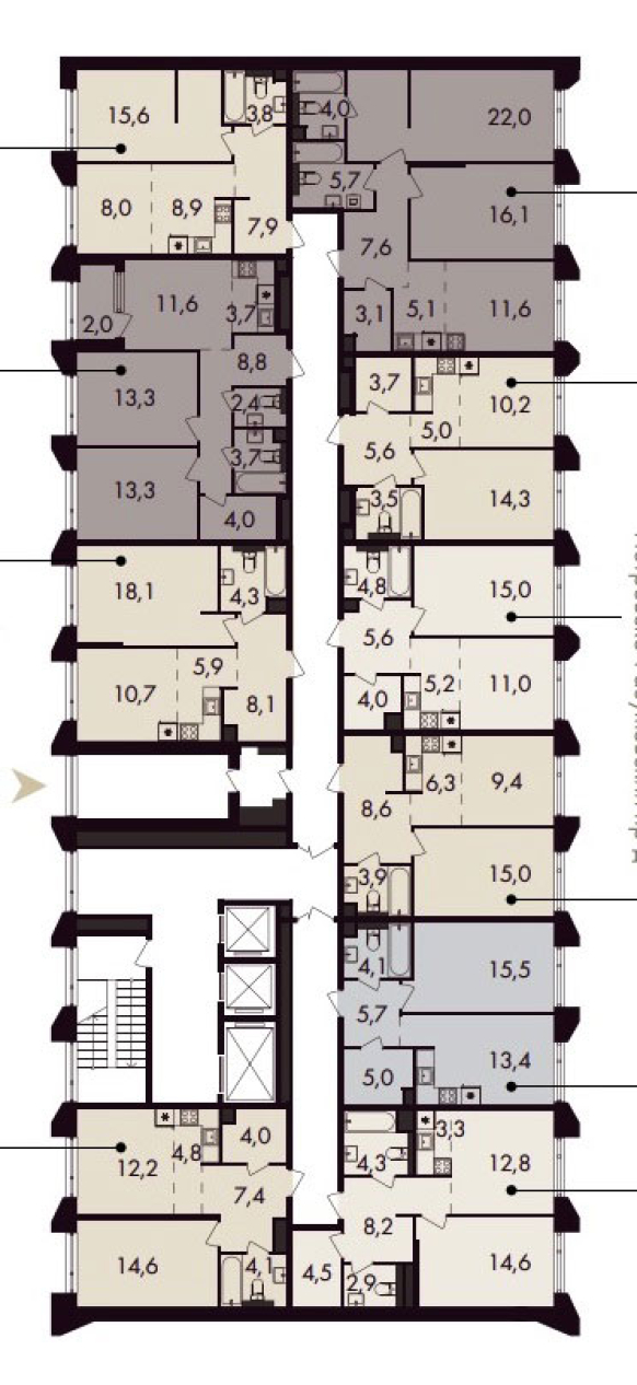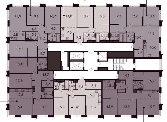 Здание восьмисекционное, на одном этаже от6до 10 квартир. В каждой секции по 2 или 3 лифта грузоподъемностью не менее 1000 килограмм с дизайнерской отделкой кабин. В подземной части здания разместится автопарковка на 330 машино мест и 186 кладовых. Еще 298 кладовых оборудуют на этажах. Площадь машиноместа 13,25 кв.м., площадь кладовых от 2,2 до 15,3 кв.м. Около 100 гостевых парковочных мест будет оборудовано на поверхности земли непосредственно на объекте и за его пределами.