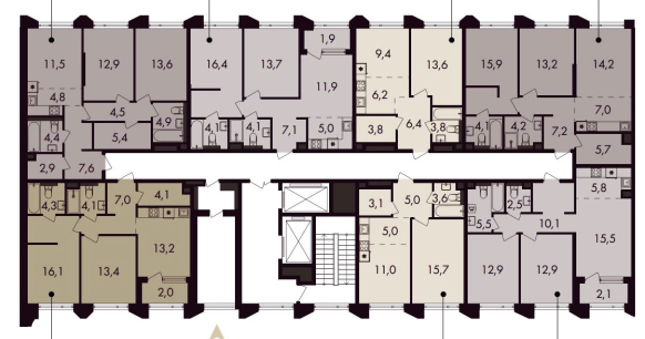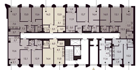 Планировка студий традиционна и весьма лаконична. Входная зона площадью от 4,5 до 9,1 кв.м., совмещенный санузел площадью около 3,5 кв.м., универсальное помещение площадью от 14,9 до 16,4 кв.м.