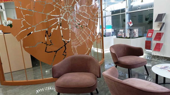 Здесь обустроено восемь рабочих мест для общения менеджеров по продажам с посетителями, оснащенных компьютерной техникой. Есть стойка регистрации, несколько макетов (среди которых пока нет макета ЖК «Петровский парк II»), зона отдыха.