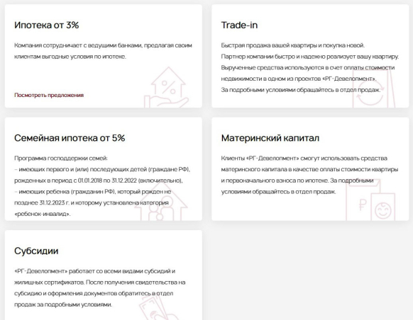 Застройщик может предложить выгодные условия получения ипотечного кредита. Здесь и ипотека от 3%, и семейная ипотека от 5% и покупка с использованием материнского капитала и всех видов субсидий. Есть и другие варианты покупки квартиры, например, с продажей покупателем застройщику своей старой квартиры (трейд-ин).