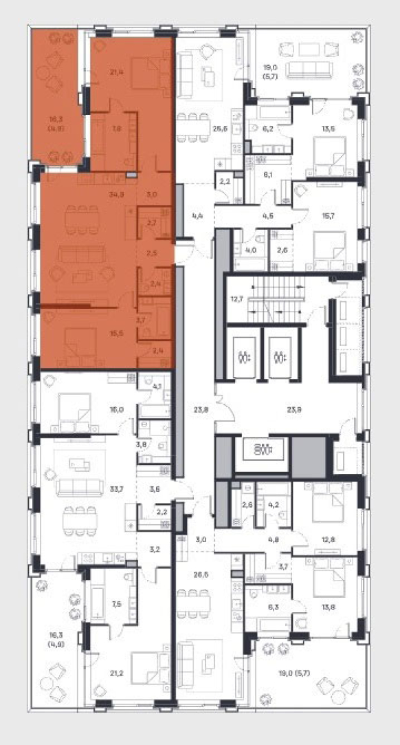 Четырехкомнатные квартиры предоставляют собственнику максимальный жизненный простор. В его распоряжении входная зона площадью от 14,4 до 18,7 кв.м. (с учетом внутреннего коридора), два или три санузла с площадью помещений от 3,7 до 5,9 кв.м., кухня или кухня-гостиная в евро-вариантах площадью от 23,9 до 35,5 кв.м., одна или две гардеробные площадью от 2,7 до 6,5 кв.м., одна или две постирочные площадью от 3,7 кв.м., один или два балкона площадью от 8,3 до 11,0 кв.м. Расположение комнат угловое, встречаются помещения с двумя окнами, есть мастер-спальни с собственной санитарной зоной.