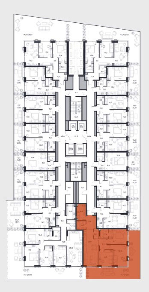 В корпусах установят по три или четыре лифта. На одном этаже в секции спроектировано от 8 до 16 квартир. В подземном этаже оборудуют автопарковку и кладовые помещения для хранения личных вещей. В первой очереди будет 176 машиномест и 20 кладовых. Площадь машиномест от 13,3 до 18,0 кв.м., площадь кладовок от 3,1 до 7,7 кв.м. Еще 84 парковочных места будут оборудованы на территории комплекса и вне ее.