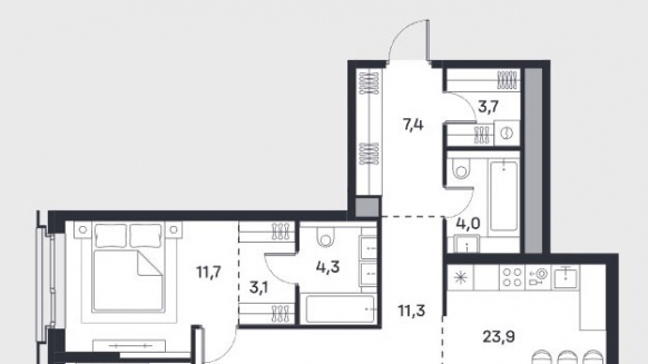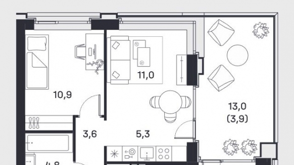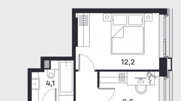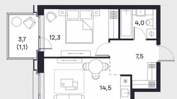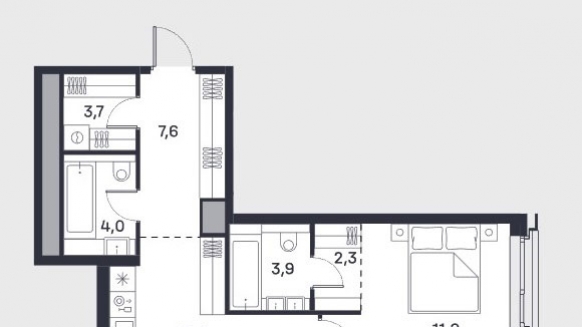 В однокомнатных квартирах запроектирована входная зона площадью от 3,9 до 7,5 кв.м., совмещенный санузел площадью от 3,3 до 4,0 кв.м., кухня площадью от 13,2 до 21,1 кв.м. и спальня площадью от 12,1 до 13,4 кв.м. Встречается балкон площадью 3,7 кв.м. Расположение окон может быть односторонним и угловым.