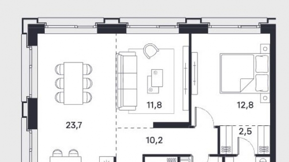 В двухкомнатных квартирах имеется входная зона площадью от 2,5 до 11,0 кв.м. (с учетом внутреннего коридора), один, два или три санузла с площадью помещений от 2,4 до 7,8 кв.м., кухня площадью от 13,7 до 34,9 кв.м. и две спальни площадью от 9,6 до 21,4 кв.м. Встречаются гардеробные площадью от 2,4 до 4,7 кв.м., а также террасы площадью от 9,3 до 16,3 кв.м. Расположение комнат угловое и одностороннее, встречаются комнаты с двумя окнами и мастер-спальни.