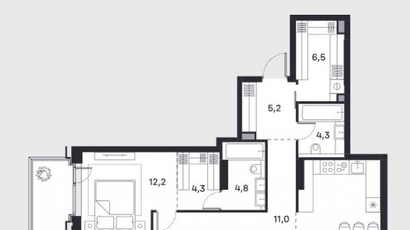 Трехкомнатные квартиры располагают входной зоной площадью от 4,4 до 7,6 кв.м., двумя санузлами площадью от 3,9 до 4,8 кв.м., кухней или кухней гостиной в евро-вариантах площадью от 16,3 до 23,8 кв.м., двумя или тремя спальнями площадью от 10,1 до 14,7 кв.м., постирочной площадью от 2,3 до 6,8 кв.м., одной или двумя гардеробными площадью от 2,3 до 3,7 кв.м. и террасой площадью 47,7 кв.м. Расположение комнат угловое, встречаются комнаты с двумя окнами и мастер-спальни.