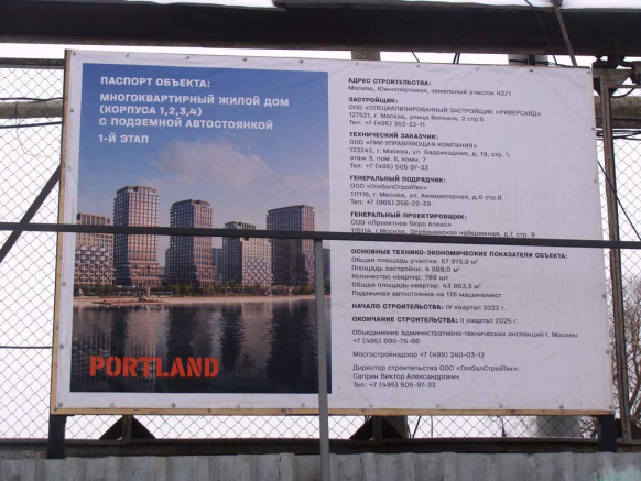 Строительство ведется на участке с кадастровымномером77:04:0003005:7403, который находится в аренде у застройщика. Застройщик ООО «Специализированный застройщик «Риверсайд», созданное в апреле 1996 года. За три года, предшествовавшие подаче проектной декларации на данный объект фирма не вела никакого жилищного строительства.
