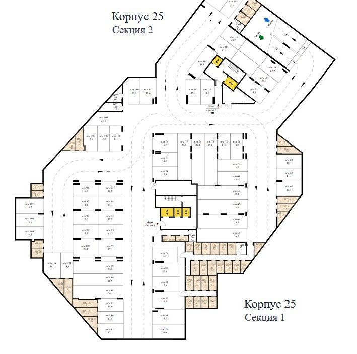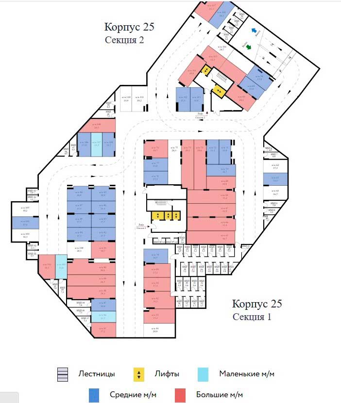 Здание двухсекционное. В секциях по 2 и 3 пассажирских и грузопассажирских лифта грузоподъемностью 400 и 1000 килограммов. В секции на одном этаже 9 квартир.
