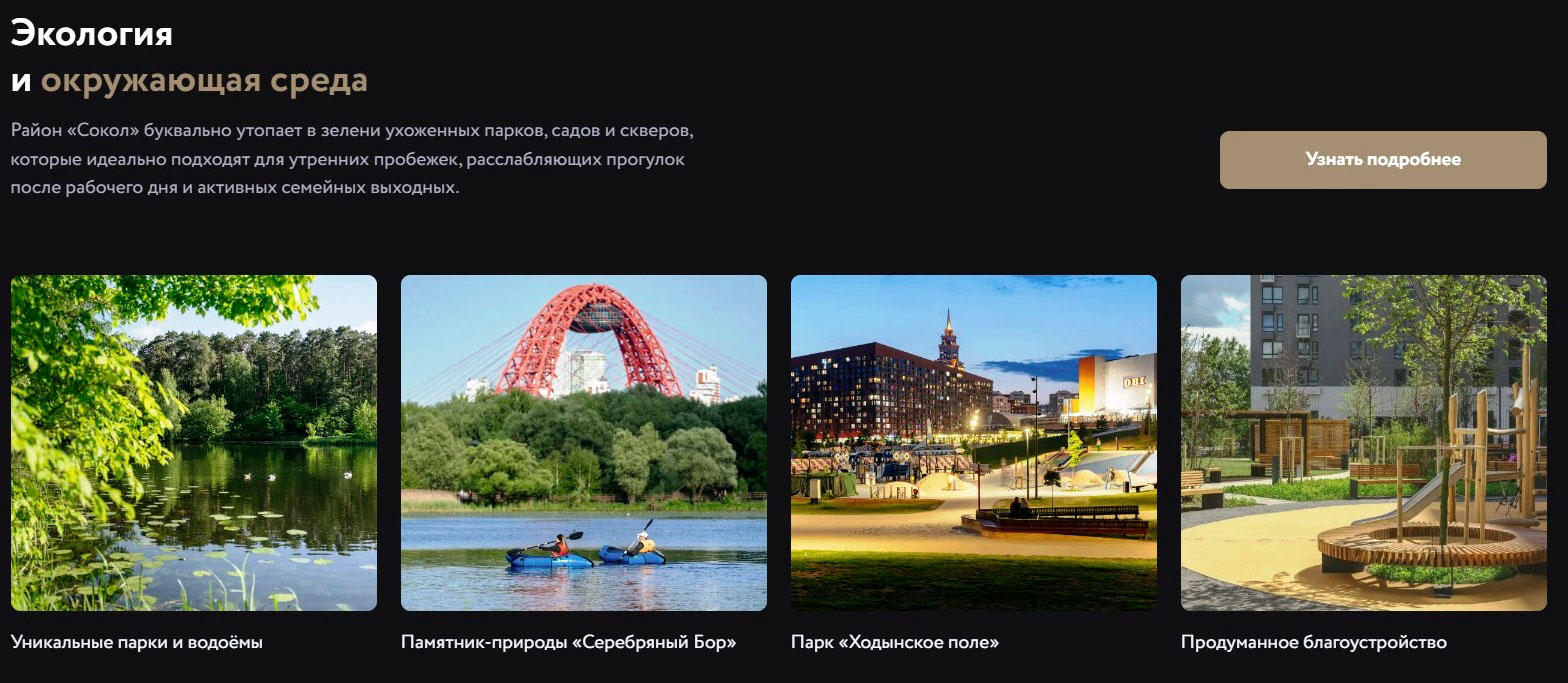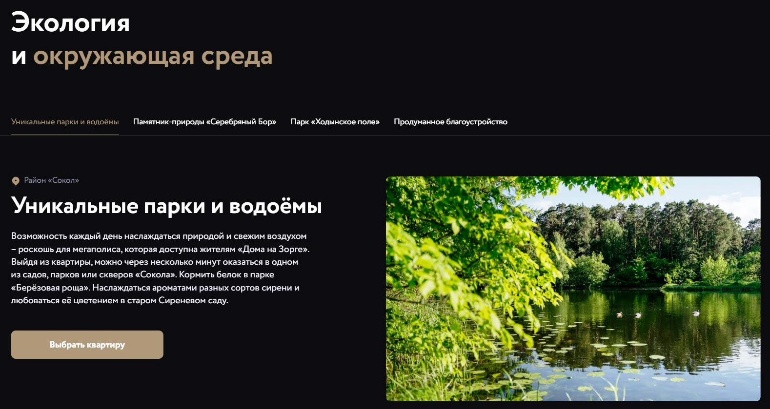 Приведены примеры экологических преимуществ, связанных с близостью городских парков. Показаны в рендерах варианты отделки квартир и благоустройства дворовой территории.