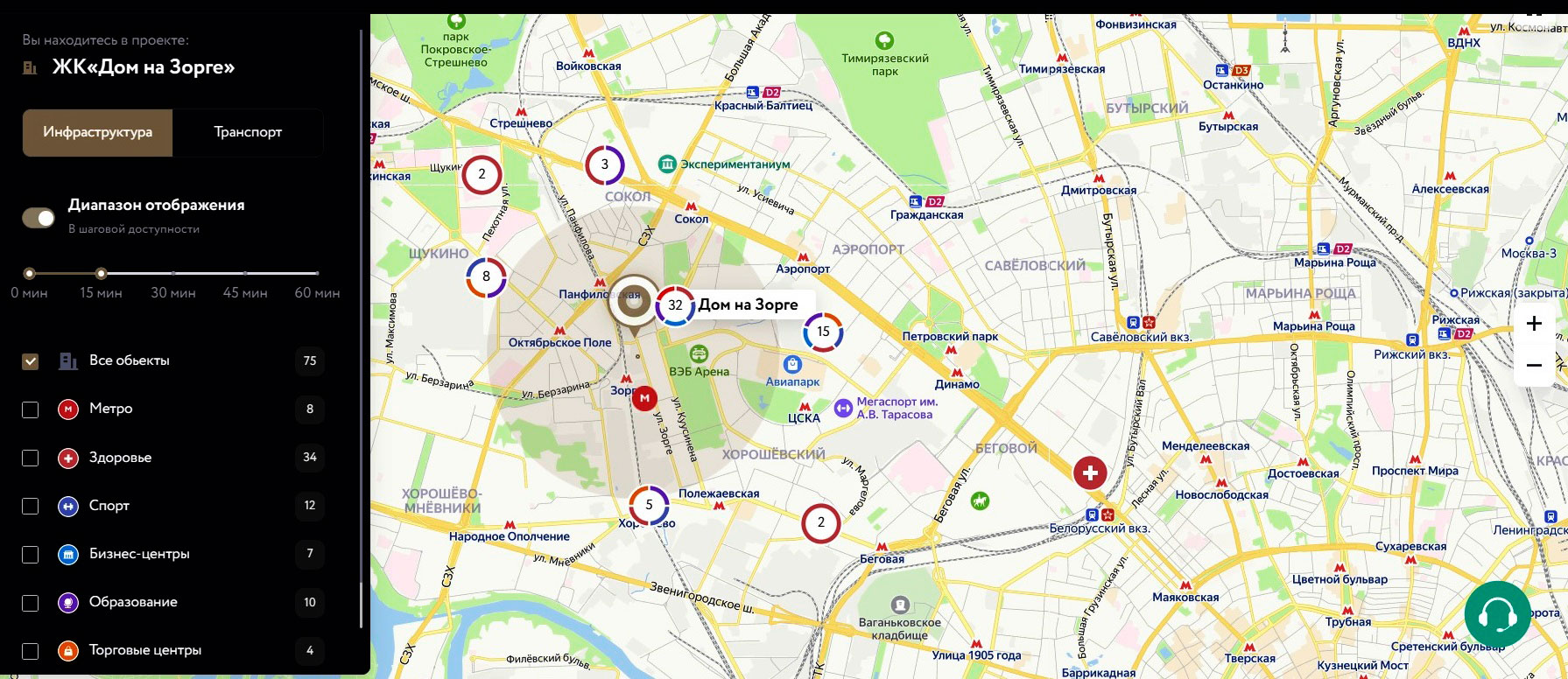 Транспортная доступность комплекса довольно высокая: в 8 минутах ходьбы расположена станция МЦК «Зорге», по улице Зорге курсируют городские автобусы, еще больше их на параллельной улице Куусинена.