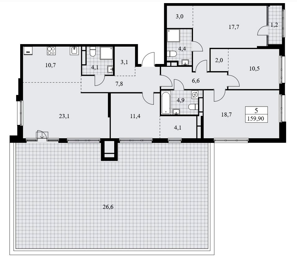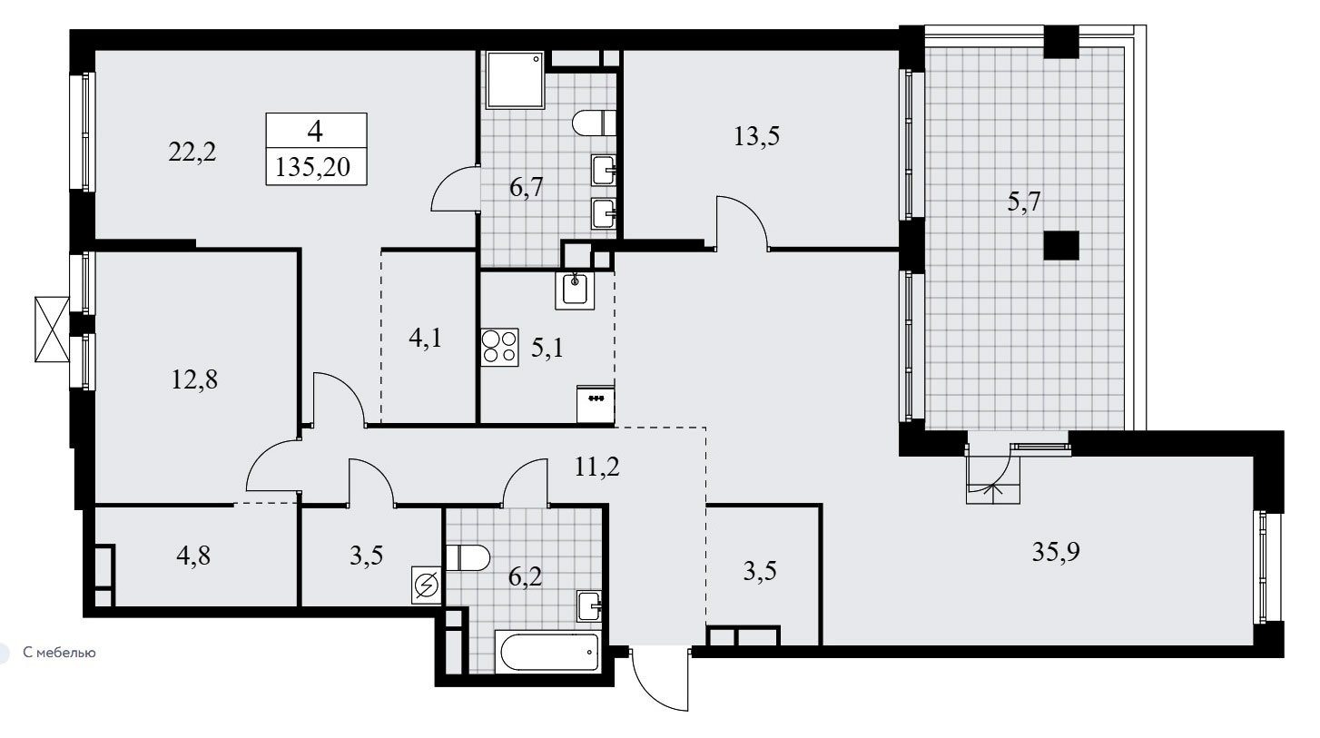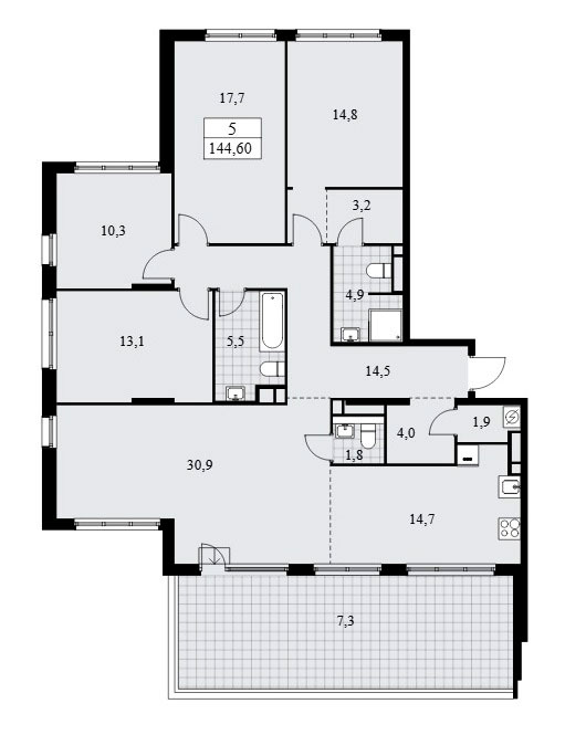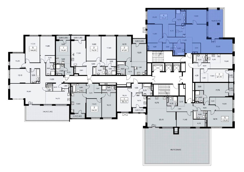 В пятикомнатных квартирах евро-планировки предусмотрена входная зона площадью от 14,7 до 17,5 кв.м., три санузла с площадью помещений от 1,8 до 5,5 кв.м., кухня-гостиная площадью от 33,8 до 45,6 кв.м., четыре спальни площадью от 10,3 до 20,7 кв.м. и подсобные помещения площадью от 3,0 до 4,1 кв.м. А также террасы площадью от 7,3 до 26,6 кв.м. Расположение окон трехстороннее, имеются помещения с двумя окнами и мастер-спальни.