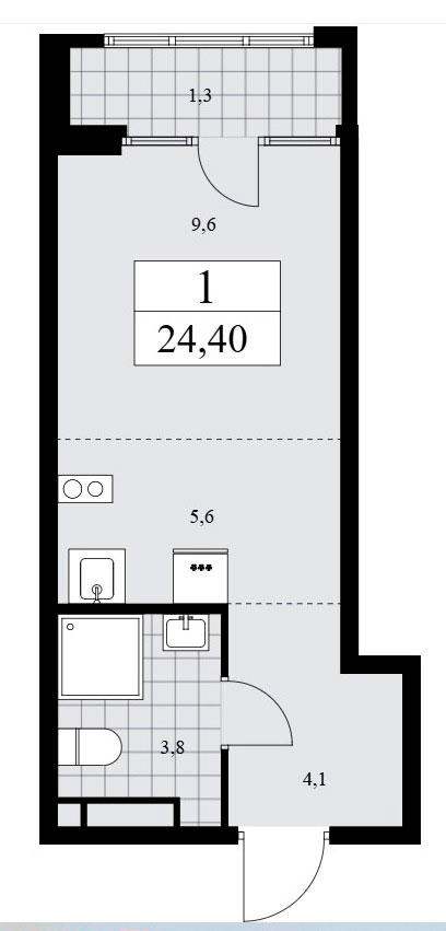 Студии располагают входной зоной от 4,1до 5,1 кв.м., совмещенным санузлом площадью от 3,8 до 5,2 кв.м. и универсальным помещением площадью от 15,2 до 21,8 кв.м. А также лоджия площадью 1,3 и более кв.м.