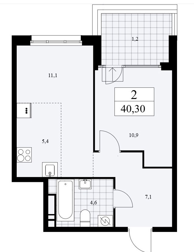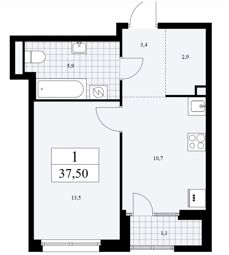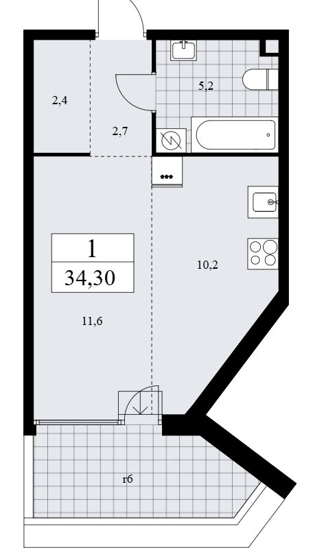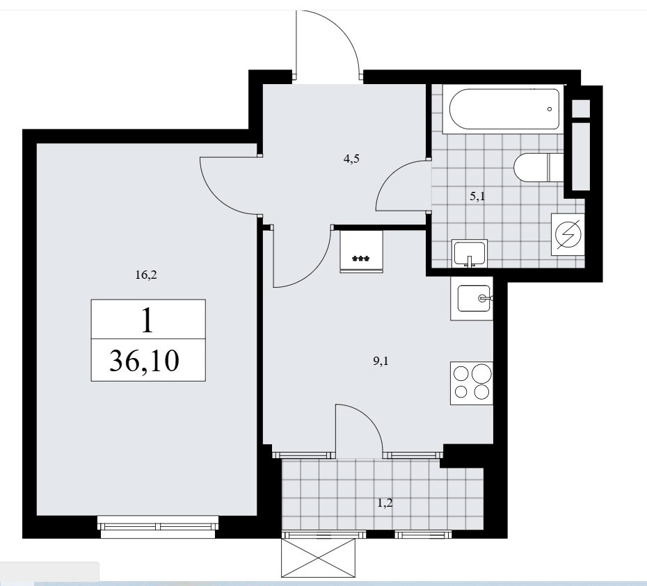 В однокомнатных квартирах находим входную зону площадью от 4,5 до 6,3 кв.м., совмещенный санузел площадью от 5,1 до 5,9 кв.м., кухню площадью от 9,14 до 10,7 кв.м и спальню площадью от 13,5 до 16,2 кв.м. Плюс лоджия площадью от 1,1 до 1,2 кв.м.