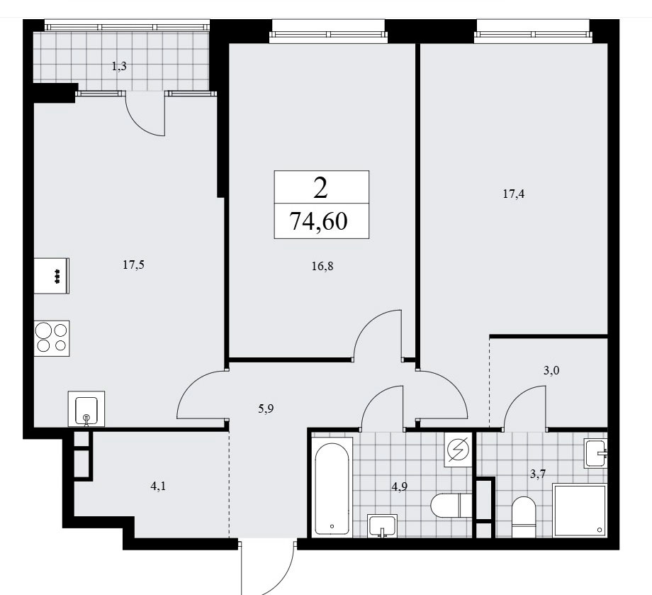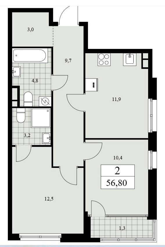 Двухкомнатные квартиры располагают входной зоной площадью от 5,9 до 9,7 кв.м., одним или двумя санузлами с площадью помещений от 3,2 до 4,9 кв.м, кухней-гостиной в евровариантах планировки площадью 16,5 кв.м. и кухней площадью от 11,9 до 17,5 кв.м. в «классике». А также одной или двумя спальнями площадью от 10,4 до 17,4 кв.м., лоджией площадью от 1,2 до 1,3 кв.м. и гардеробными площадью от 3,0 до 4,1 кв.м. Расположение окон одностороннее и угловое, есть мастер-спальни.