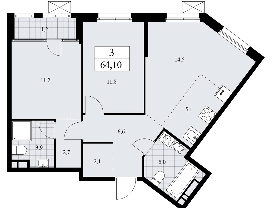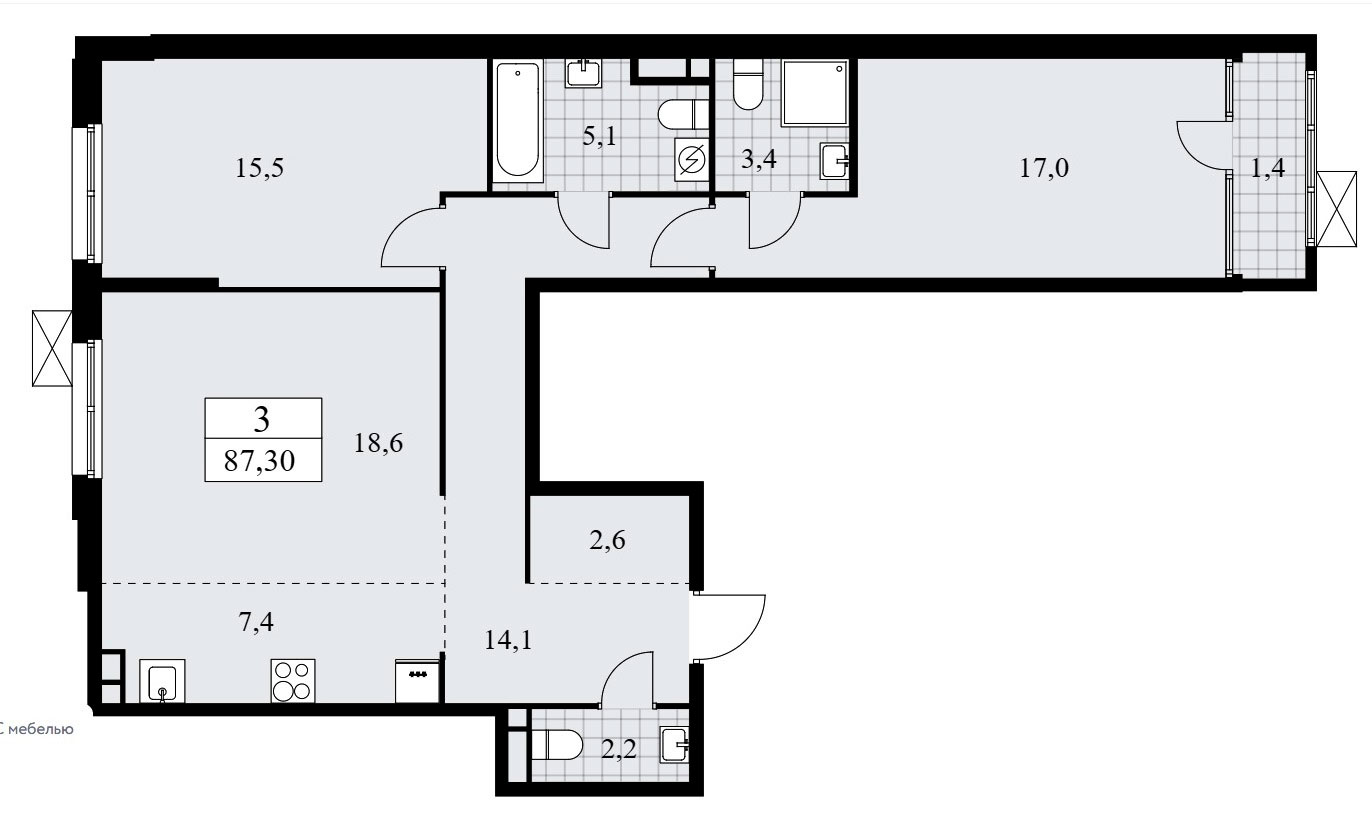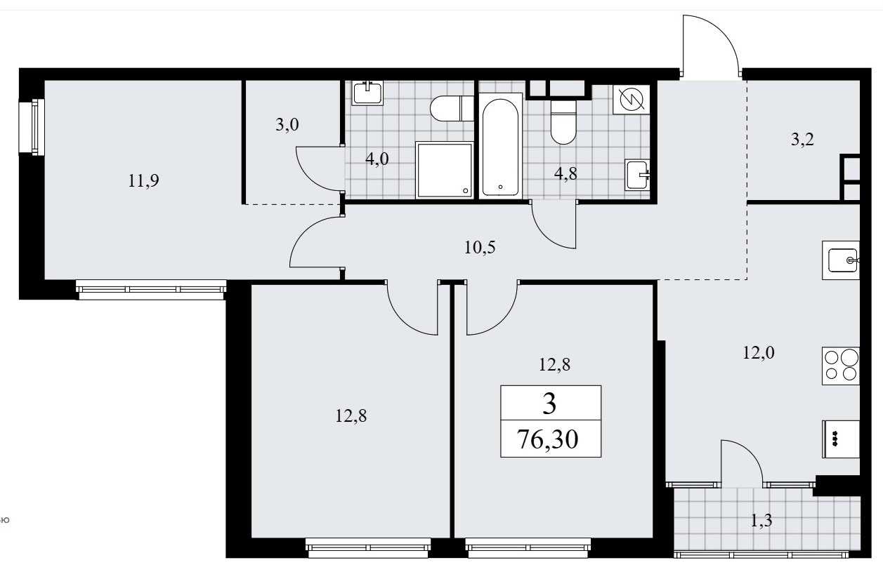В проектировке трехкомнатных квартир встречаются входная зона площадью от 8,7 до 16,7 кв.м. (с учетом внутреннего коридора), два или три санузла с площадью помещений от 2,2 до 5,0 кв.м., кухня-гостиная площадью 19,6 до 26,0 кв.м. в евровариантах планировки и кухня площадью 12,0 кв.м. в «классике», две или три спальни площадью от 11,2 до 17,0 кв.м. Встречаются гардеробные площадью от 2,7 до 3,0 кв.м. и лоджии площадью от 1,2 до 1,4 кв.м. Расположение окон двухстороннее и угловое, есть помещения с двумя окнами, встречаются мастер-спальни.