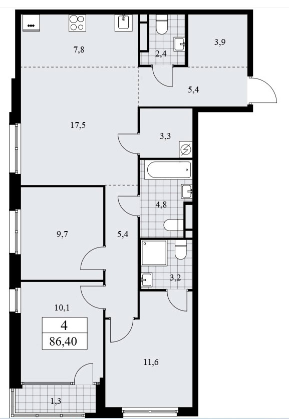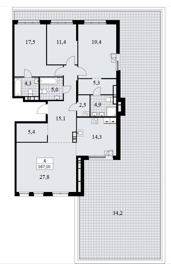 В четырехкомнатных квартирах евро-планировки запроектирована входная зона площадью от 9,3 до 15,1 кв.м., два или три санузла с площадью помещений от 2,4 до 6,7 кв.м., кухня-гостиная площадью от 25,3 до 42,1 кв.м., три спальни площадью от 9,7 до 22,2 кв.м. Имеются подсобные помещения площадью от 2,5 до 5,4 кв.м., лоджии площадью от 1,3 до 5,7 кв.м. и террасы площадью 34,2 кв.м. Расположение окон двух- и трехстороннее, имеются помещения с двумя окнами и мастер-спальни.