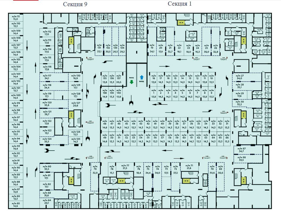 Здания высотой от 9 до 10 этажей, многосекционные, от 8 до 12 секций. На одном этаже от 4 до 11 квартир, а также один или два лифта, один из них грузоподъемностью не менее 1000 килограмм. Лифты способны опускаться на минус первый этаж, где устроят паркинг и кладовые. Размещению на автостоянке подлежат только автомобили с двигателями, работающими на бензине (100%). Площадь парковочных мест от 13,4 до 41,3 кв.м., площадь кладовых от 2,0 до 13,1 кв.м.
