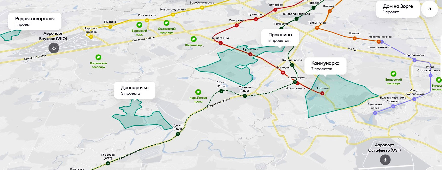 | «Скандинавия» | «Коммунарка» | 36,2 | 11 338 202 | 313 210 | Нет | 4 квартал 2026 г. |