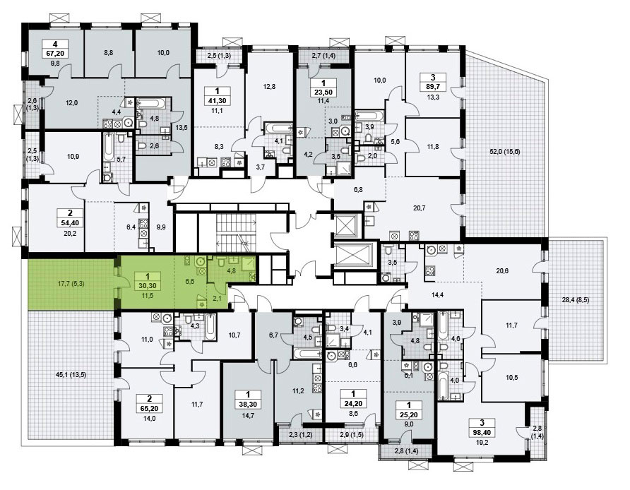 На продажу выставлены квартиры-студии, одно-, двух-, трех- и четырехкомнатные квартиры площадью от 20,2 до 128,9 кв.м.