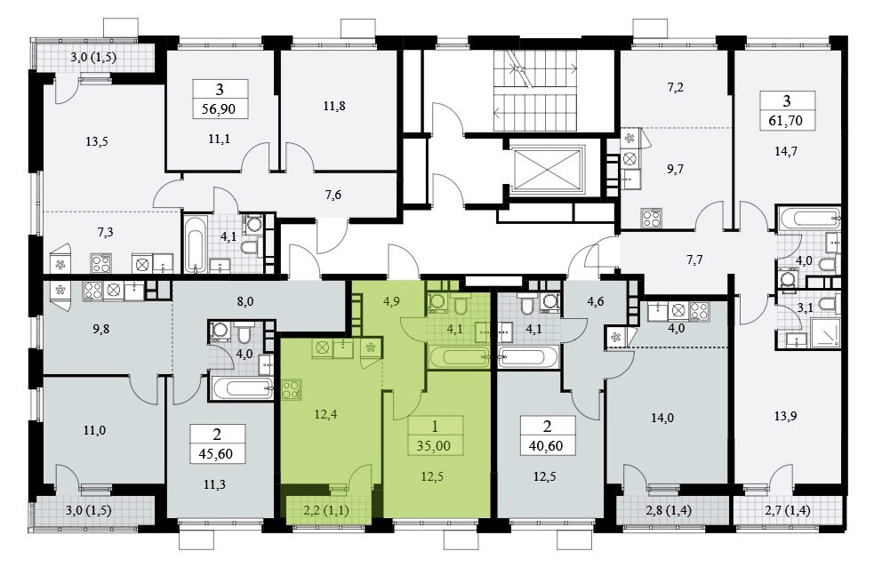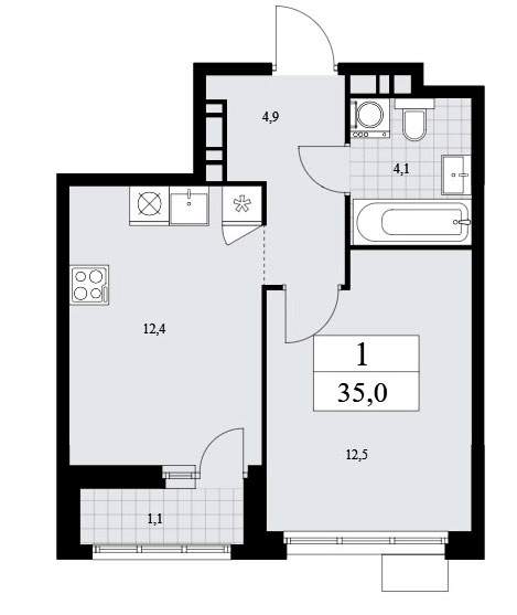 Однокомнатная квартира оснащена входной зоной площадью 4,9 кв.м., совмещенным санузлом площадью 4,1 кв.м., кухней площадью 12,4 кв.м. и спальней площадью 12,5 кв.м. Есть лоджия площадью 2,2 кв.м. Расположение окон одностороннее.