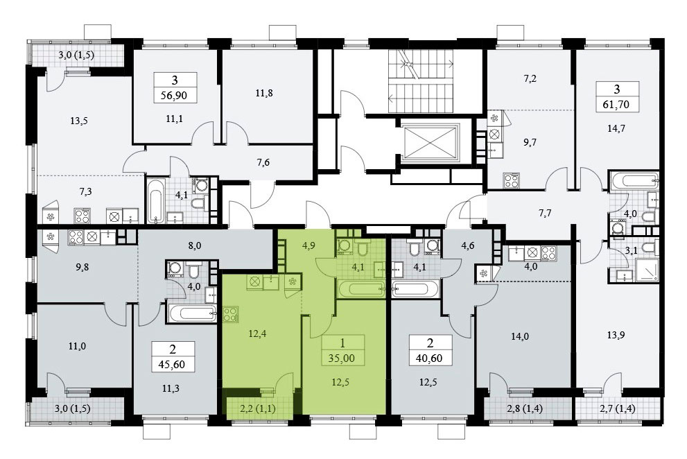 | Двухкомнатная | 35,0 – 72,7 | 9 426 725 – 16 536 117 | 269 335 – 227 457 |