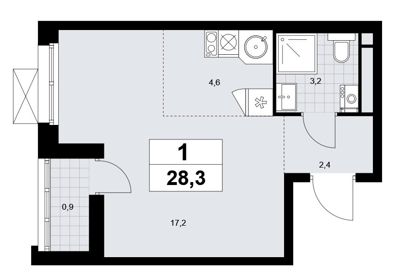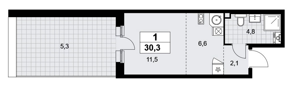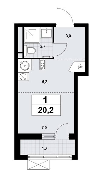 Студия располагает входной зоной площадью 3,0 кв.м., совмещенным санузлом площадью 2,7 кв.м. и универсальным помещением площадью 13,2 кв.м. Есть лоджия площадью 2,6 кв.м.