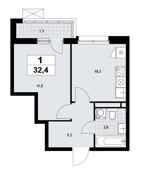 Однокомнатная квартира располагает входной зоной площадью 5,2 кв.м., совмещенным санузлом площадью около 3,9 кв.м., кухней площадью 10,2 кв.м. и спальней площадью 11,8 кв.м. А также балконом площадью 2,6 кв.м. Расположение окон одностороннее.