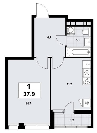 Однокомнатная квартира располагает входной зоной площадью 6,7 кв.м., совмещенным санузлом площадью 4,1 кв.м., кухней площадью 11,2 кв.м. и спальней площадью 14,7 кв.м. Имеется также лоджия площадью 2,4 кв.м.