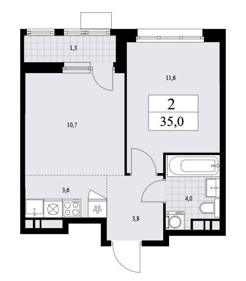 Двухкомнатная квартира евро планировки имеет входную зону площадью 3,8 кв.м., совмещенный санузел площадью 4,0 кв.м., кухню-гостиную площадью 14,3 кв.м. и спальню площадью 11,6 кв.м. Плюс лоджия площадью 2,6 кв.м. Расположение окон одностороннее.