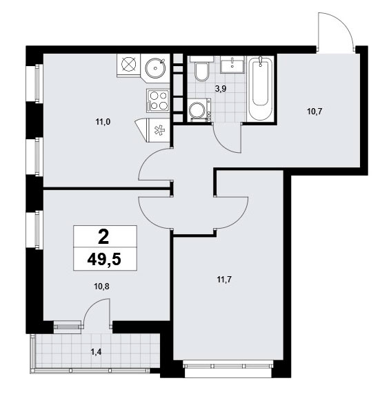 Двухкомнатная квартира оснащена входной зоной площадью 10,7 кв.м., совмещенным санузлом площадью 3,9 кв.м., кухней площадью 11,0 кв.м. и двумя спальнями площадью 10,8 и 11,7 кв.м. Есть балкон площадью 2,8 кв.м. Расположение окон угловое, есть помещение с двумя окнами.