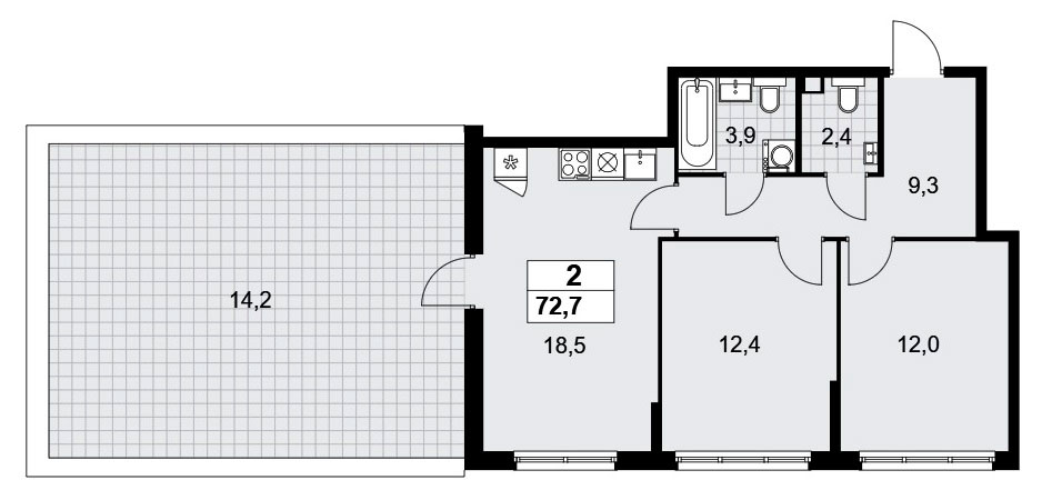 Для данной двухкомнатной квартиры запроектирована входная зона площадью 9,3 кв.м., два санузла площадью 2,4 и 3,9 кв.м., кухня площадью 18,5 кв.м. и две спальни площадью 12,0 и 12,4 кв.м. Приятным дополнением является терраса площадью 28,4 кв.м. Расположение окон одностороннее.