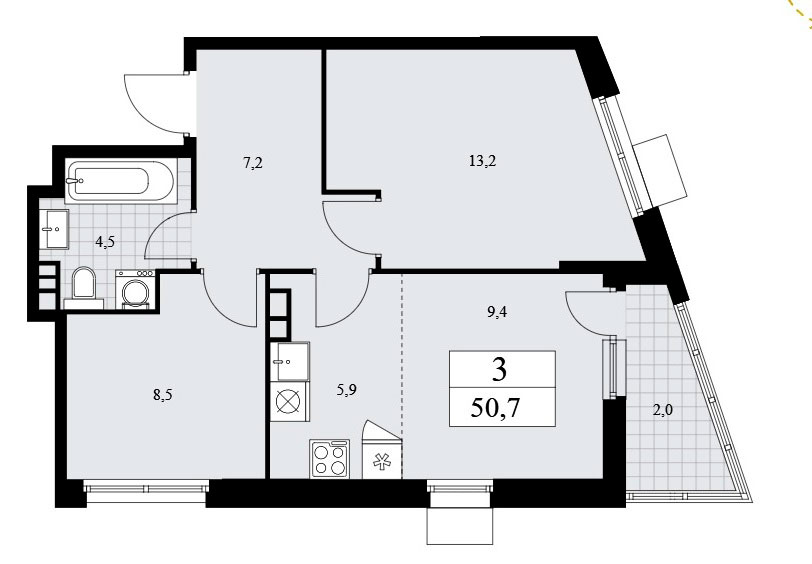 Трехкомнатная квартира евро-планировки располагает входной зоной площадью 7,2 кв.м., совмещенным санузлом площадью 4,5 кв.м., кухней-гостиной площадью 15,3 кв.м. и две спальни площадью 8,5 и 13,2 кв.м. Одна из спален пятиугольная. Есть балкон неправильной формы площадью 4,0. Расположение окон угловое.