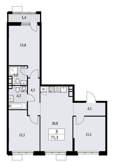 Трехкомнатная квартира оснащена входной зоной площадью 4,1 кв.м., двумя санузлами с площадью 3,2 и 4,3 кв.м., кухней-гостиной площадью 20,8 кв.м. и тремя спальнями площадью 11,1, 12,1 и 13,8 кв.м. Расположение окон на две стороны, имеется лоджия площадью 2,8 кв.м.