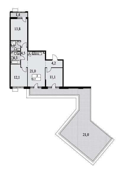 Трехкомнатная квартира располагает входной зоной площадью 4,2 кв.м., двумя санузлами площадью 3,5 и 4,3 кв.м., кухней-гостиной площадью 21,0 кв.м. и тремя спальнями площадью от 11,1 до 13,8 кв.м. Имеется терраса площадью 42,0 кв.м. и лоджия площадью 2,8 кв.м. Расположение окон двухстороннее.
