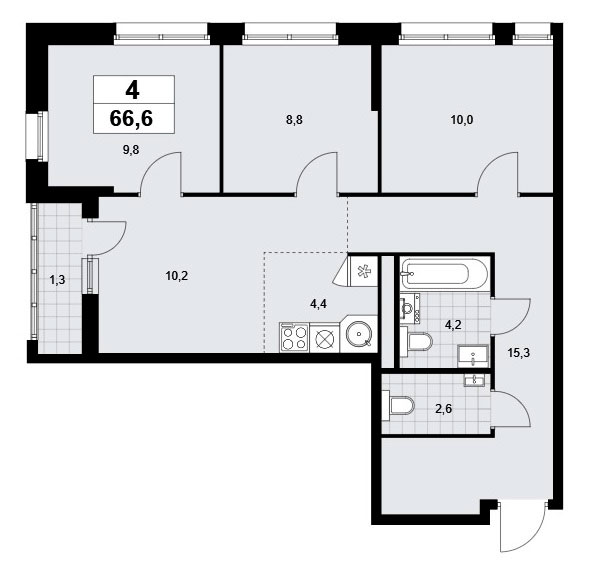 В четырехкомнатной квартире евро-планировки запроектирована входная зона площадью 15,3 кв.м., два санузла площадью 2,6 и 4,2 кв.м., кухня-гостиная площадью 14,6 кв.м., три спальни площадью от 8,8 до 10,0 кв.м. Имеется лоджия площадью 2,6 кв.м. Есть помещения с двумя окнами, расположение окон угловое.