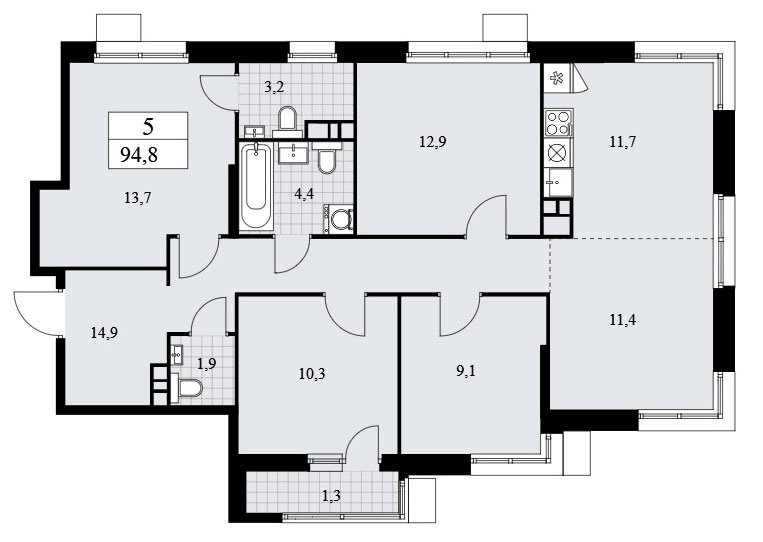 Четырехкомнатная квартира классической планировки имеет входную зону площадью 14,9 кв.м., три санузла с площадью помещений от 1,9 до 4,4 кв.м., один из них с окном, кухню-гостиную площадью 23,1 кв.м. и четыре спальни площадью от 9,1 до 13,7 кв.м. Есть лоджия площадью 2,6 кв.м. Расположение окон на три стороны, в кухне-гостиной три окна, два из них угловой конструкции. Имеется мастер-спальня.