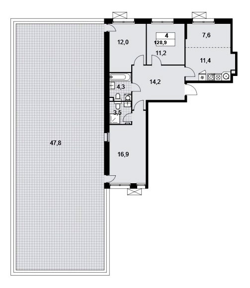 Просторная четырехкомнатная квартира евро-планировки имеет входную зону площадью 14,2 кв.м., два санузла площадью 3,5 и 4,3 кв.м., три спальни площадью от 11,2 до 16,9 кв.м. Плюс огромная терраса площадью 95,6 кв.м. Расположение окон на две стороны, а на третью сторону обращена терраса. Имеется мастер-спальня.