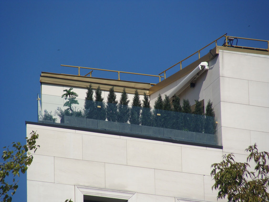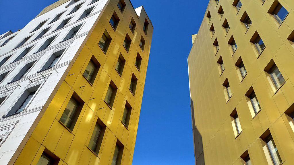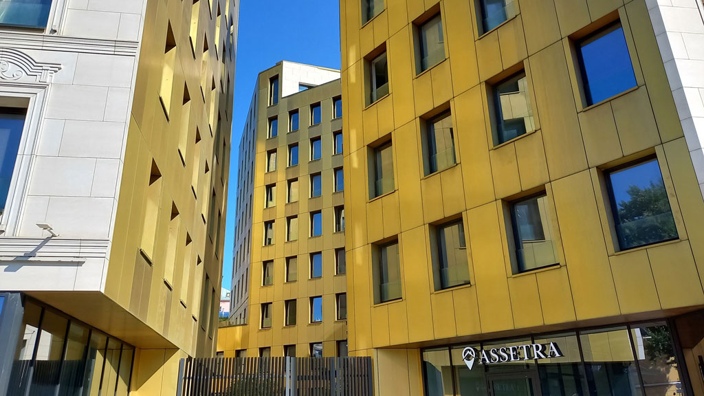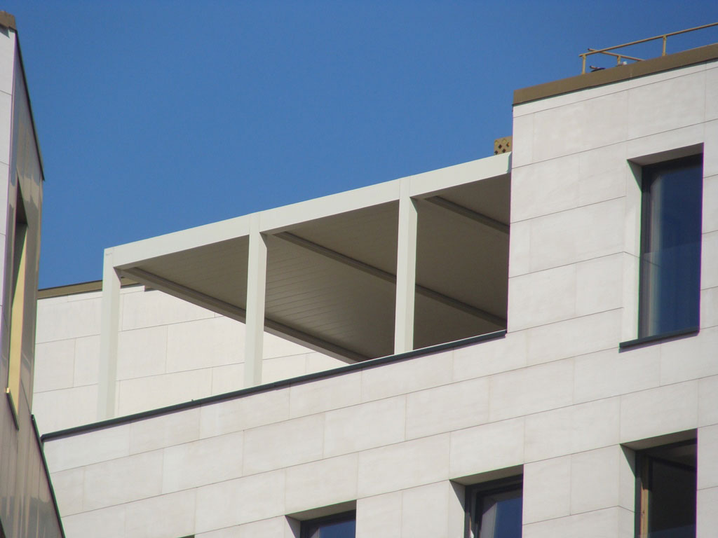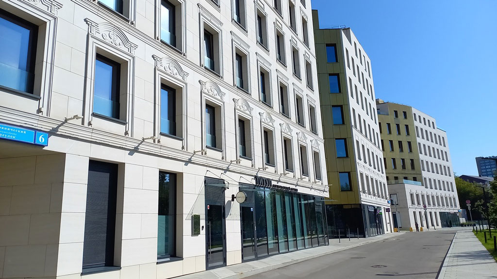 На фасадах нет ничего лишнего - ни балконов, ни корзин для внешних блоков кондиционеров. Только открытые террасы на верхних этажах с прозрачным ограждением.