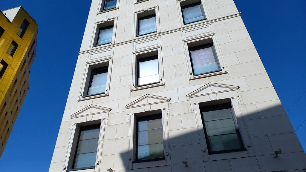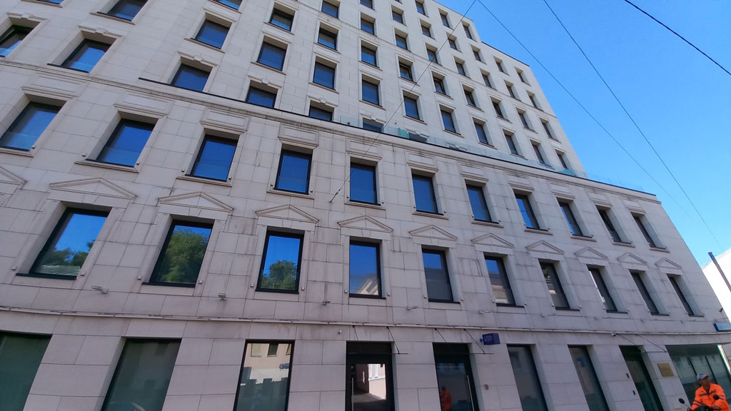 Фасады изготовлены из светлого мрамора в сочетании с медью, резными наличниками и витражным профилем. Все это свидетельствует о слиянии традиций классицизма и модернизма в архитектурном облике комплекса.