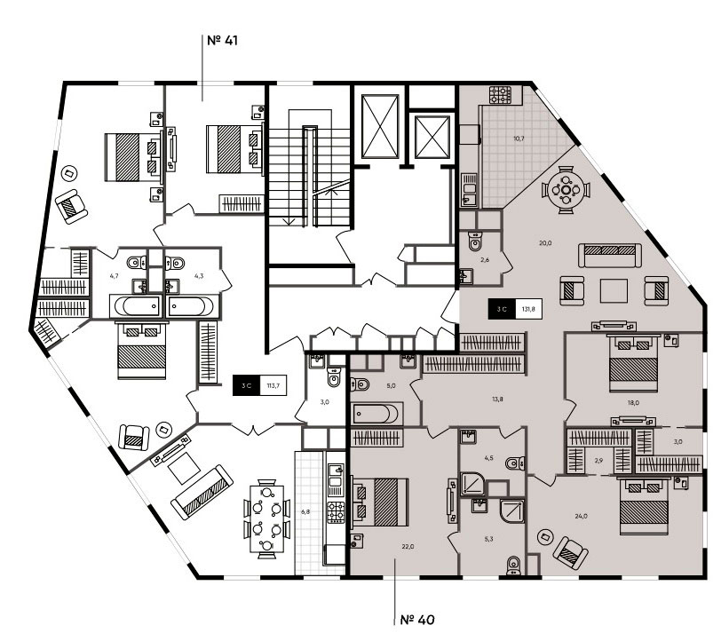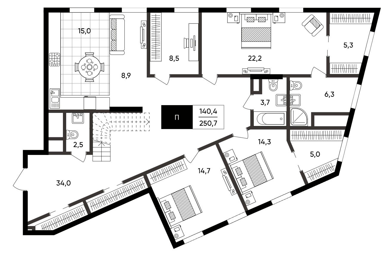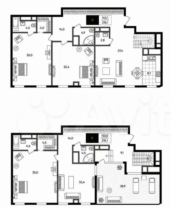 Четырехкомнатная квартира спроектирована в двух уровнях. В общей сложности она имеет входную зону площадью 23,1 кв.м., пять санузлов площадью от 2,3 до 4,9 кв.м., кухню-гостиную площадью 45,5 кв.м. и четыре спальни площадью от 28,9 до 35,0 кв.м. Две спальни в формате «мастер» с собственными гардеробными внутри площадью 4,5 кв.м. Расположение окон одностороннее, есть помещения с тремя окнами.