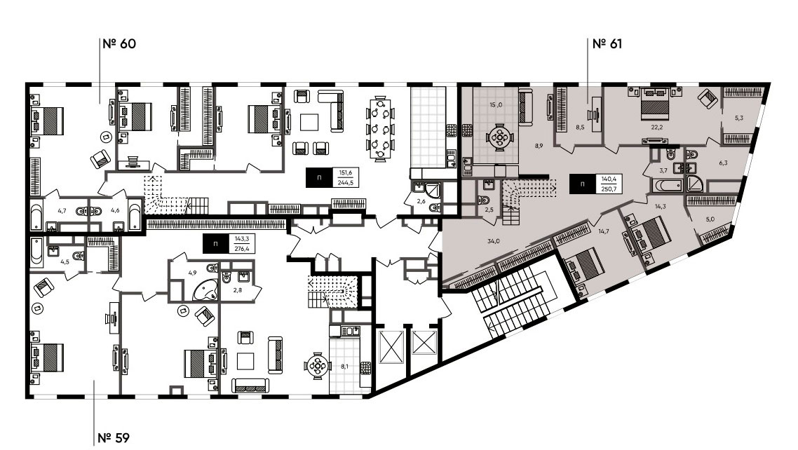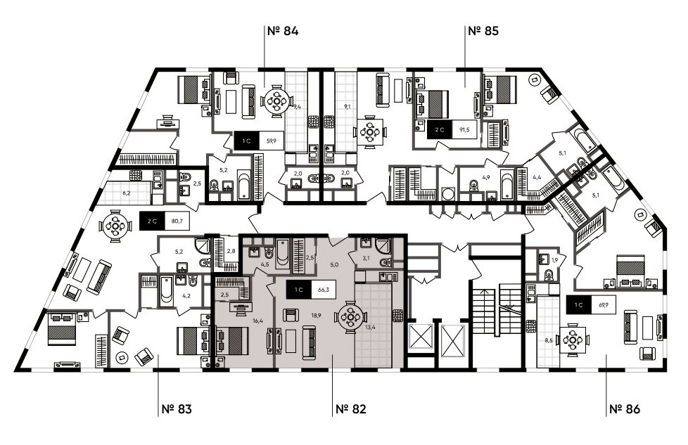 На продажу выставлены одно-, двух-, трех- и четырехкомнатные квартиры площадью от 66,3 до 271,1 кв.м.