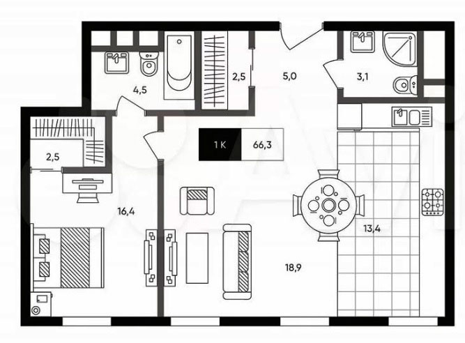 Однокомнатный апартамент с входной зоной площадью 5,0 кв.м., двумя санузлами площадью 3,1 и 4,5 кв.м., кухней площадью 32,3 кв.м. и спальней площадью 16,4 кв.м., спроектированной в формате «мастер». Есть две гардеробных площадью 2,5 кв.м. Расположение окон одностороннее, есть помещения с тремя окнами.