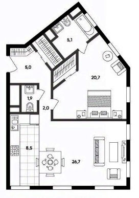 В «двушке» евро-формата запроектированы входная зона площадью 7,0 кв.м., два санузла с площадью помещений 1,9 и 5,1 кв.м., кухня-гостиная площадью 35,2 кв.м. и спальня площадью 20,7 кв.м. Расположение окон трехстороннее, есть помещение с пятью окнами. Мастер-спальня имеет пятиугольную конфигурацию.