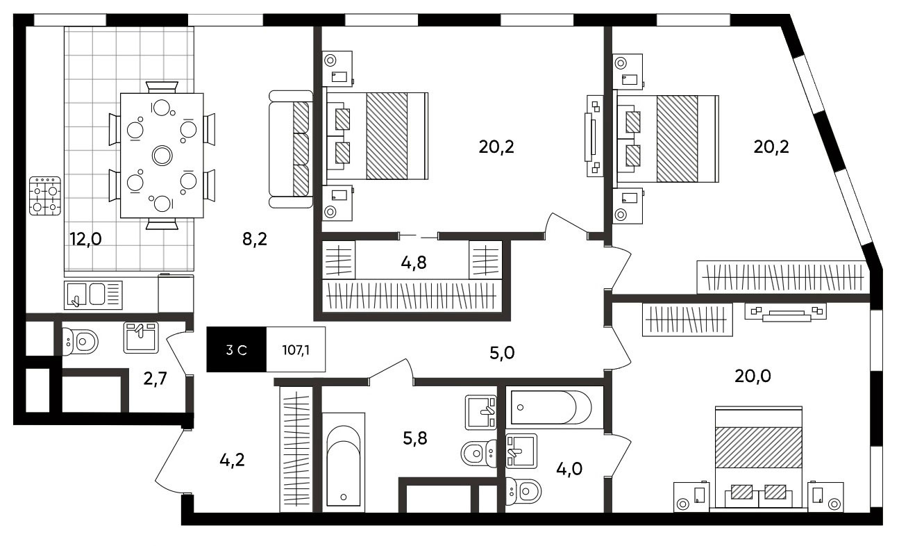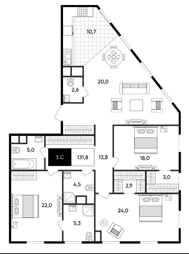 В трехкомнатном апартаменте имеется входная зона площадью 9,2 кв.м., три санузла с площадью помещений от 2,7 до 5,8 кв.м., кухня-гостиная площадью 20,2 кв.м. и три спальни площадью 20,2 кв.м., одна - мастер. Расположение окон угловое, есть помещения с тремя окнами.
