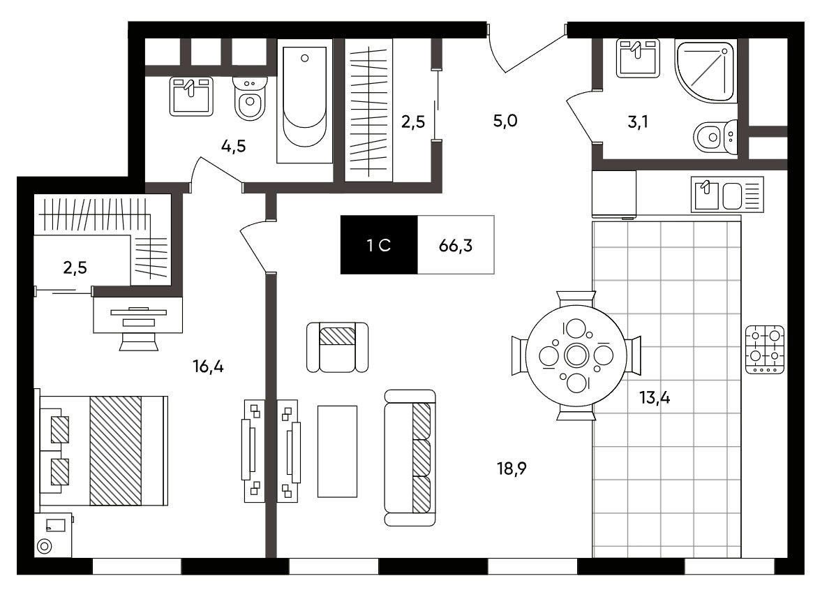 | Однокомнатный | 66,3 | 67 634 617 | 1 020 130 |