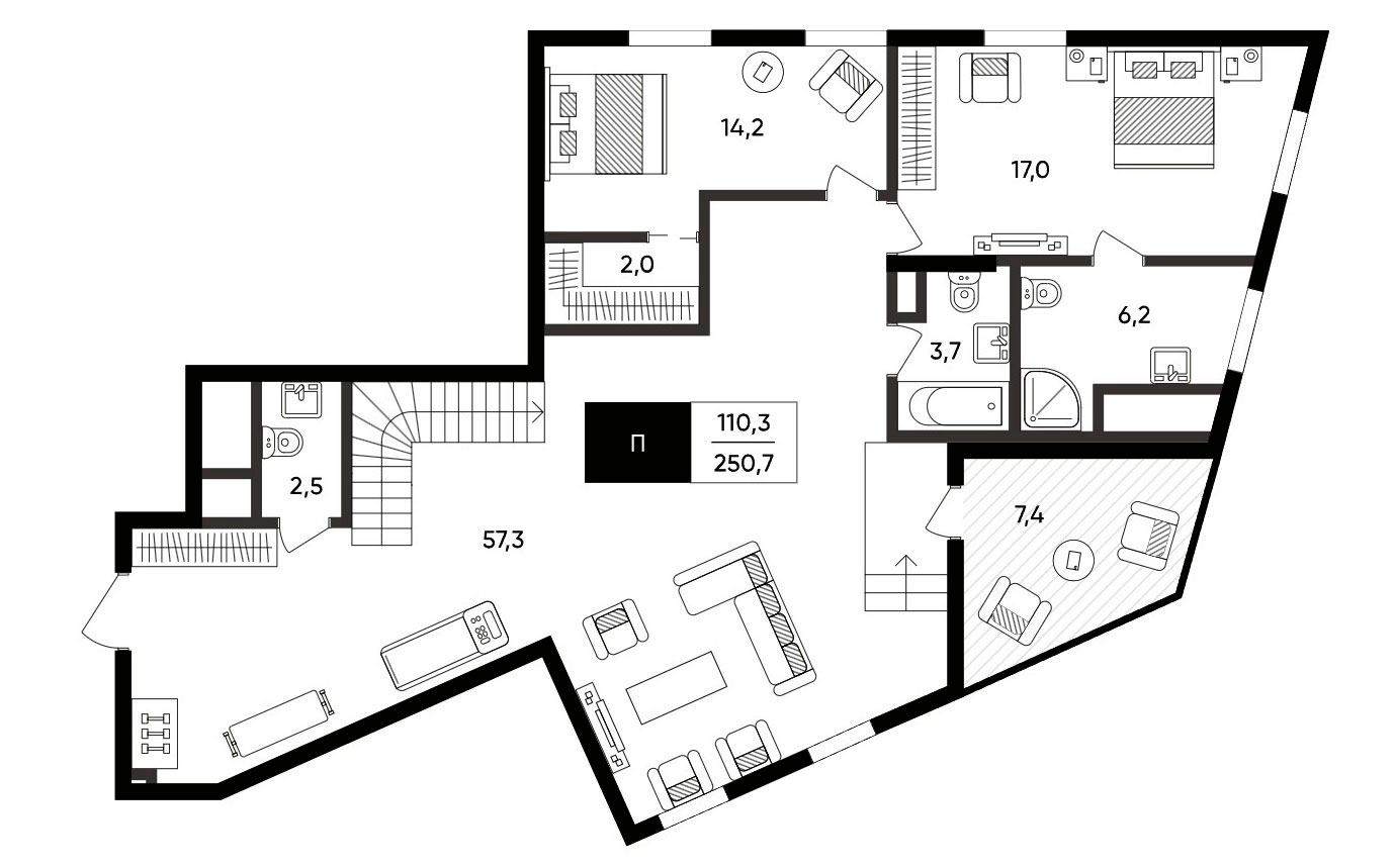 На втором этаже апартамента находим входную зону, совмещенную с зоной отдыха площадью 57,3 кв.м., три санузла площадью 2,5 и 6,2 кв.м. (один из них с окном) и две спальни площадью 14,2 и 17,0 кв.м., одна из них в формате «мастер». Есть гардеробная площадью 2,0 кв.м. и терраса площадью 7,4 кв.м. Есть помещения с пятиугольной конфигурацией, с двумя окнами. Расположение окон трехстороннее.