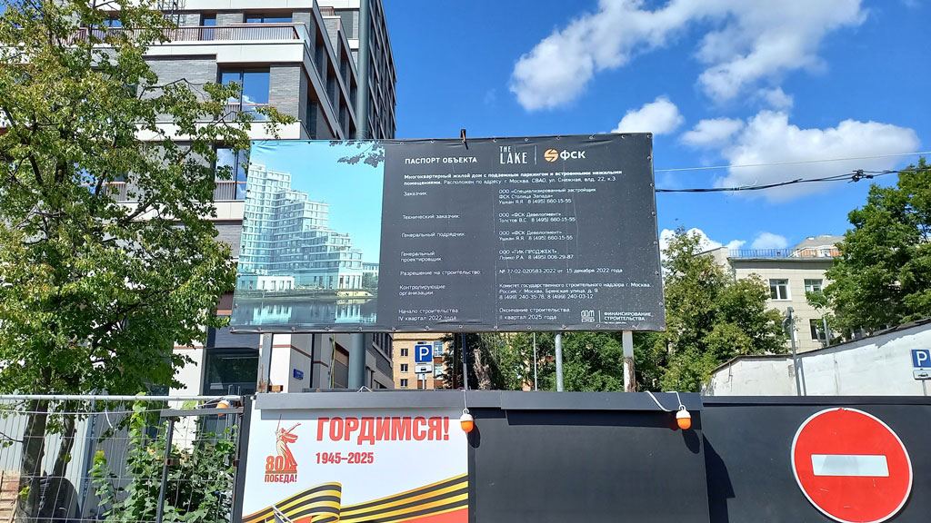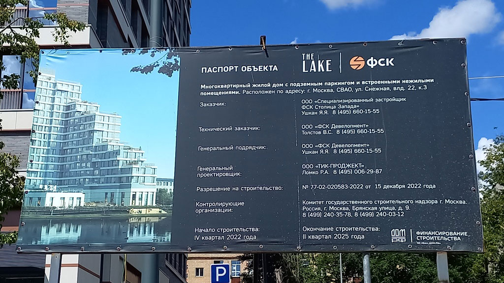 Строительство ведется на земельном участке с кадастровым номером 77:02:0015008:5. Застройщик ООО «Специализированный застройщик ФСК Столица запада». Компания создана в марте 2021 года и за последние три года другого жилищного строительства не вела. Коммерческое обозначение застройщика «ФСК Лейк».