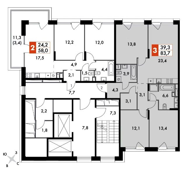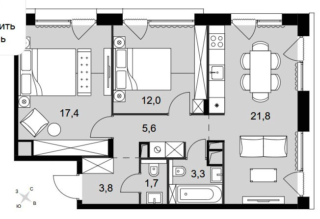 Трехкомнатная квартира в формате «евро» располагает входной зоной площадью 9,4 кв.м. (с учетом внутреннего коридора), двумя санузлами площадью 1,7 и 3,3 кв.м., кухней-гостиной площадью 21,8 кв.м. и двумя спальнями площадью 12,0 и 17,4 кв.м. Расположение окон угловое, в кухне три окна.